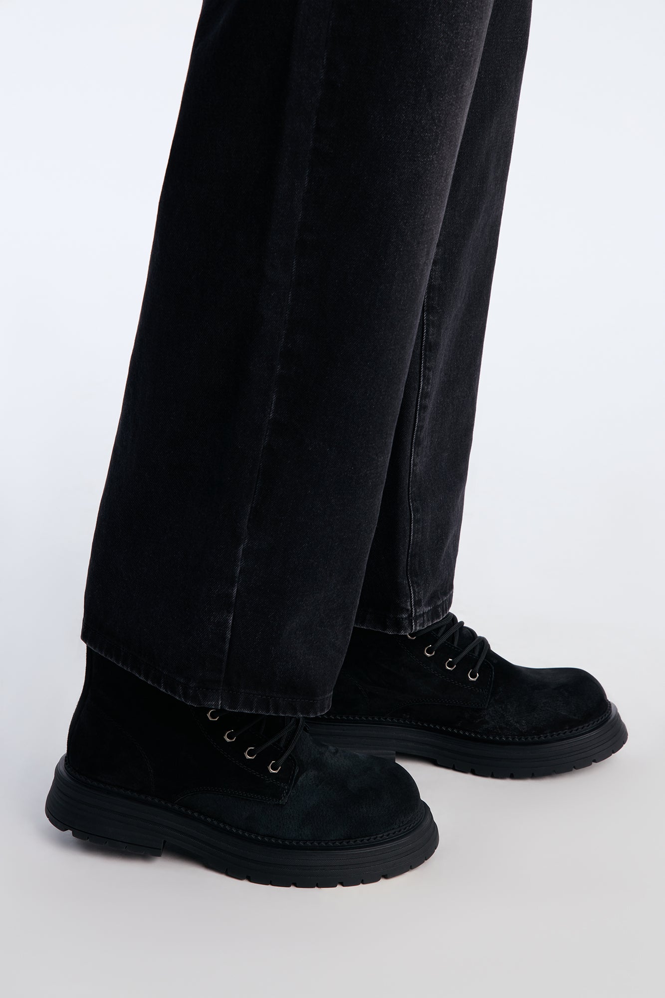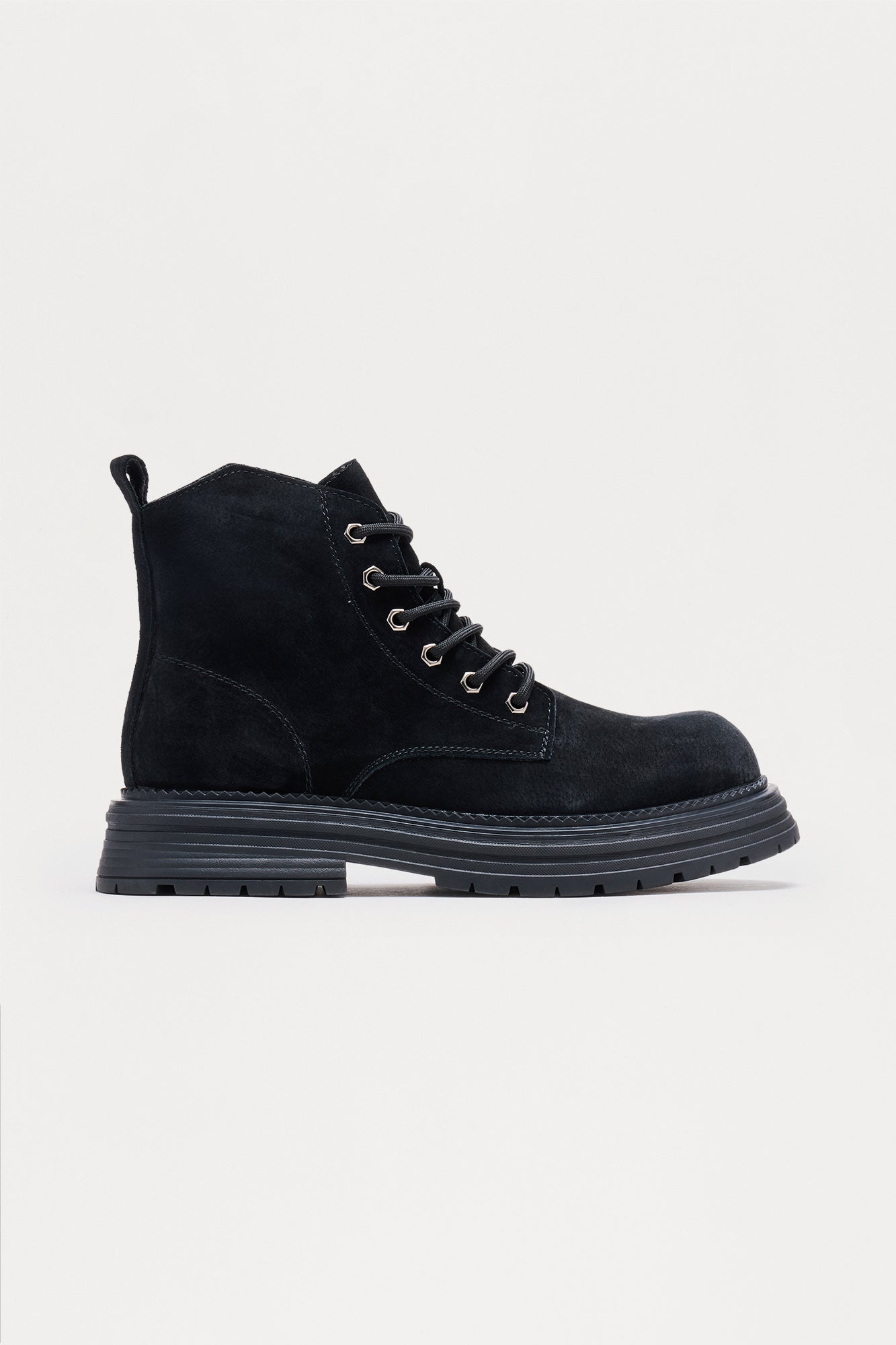 بوت فاخر مصنوع من جلد الشمواه الطبيعي. يتميز بنعل مطاطي سميك، حلقات معدنية للأربطة، وخياطة متناسقة. يجمع بين المتانة والأناقة الشتوية. مستورد.