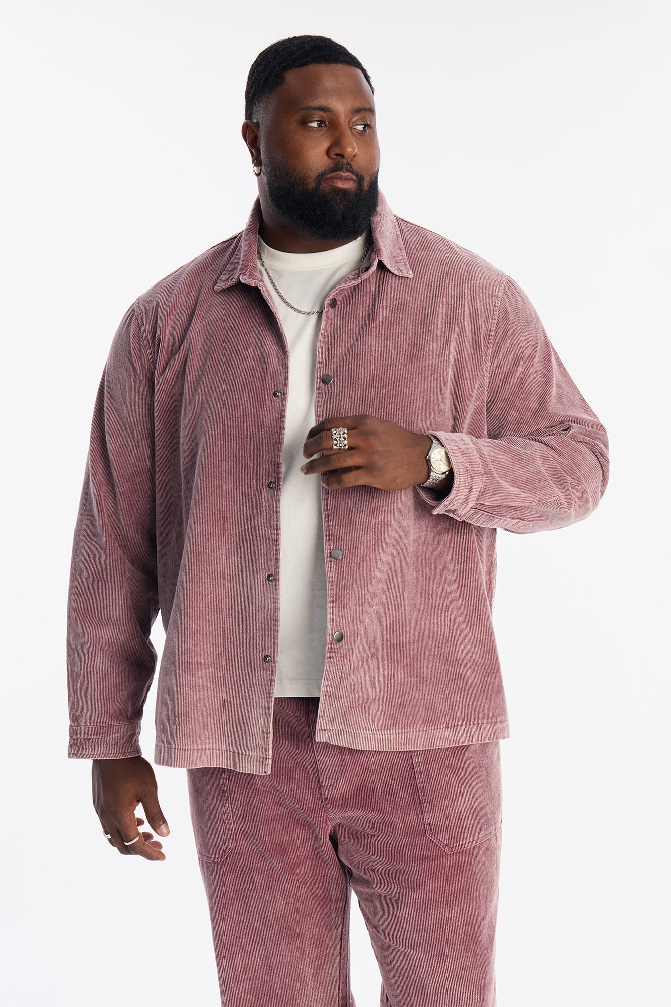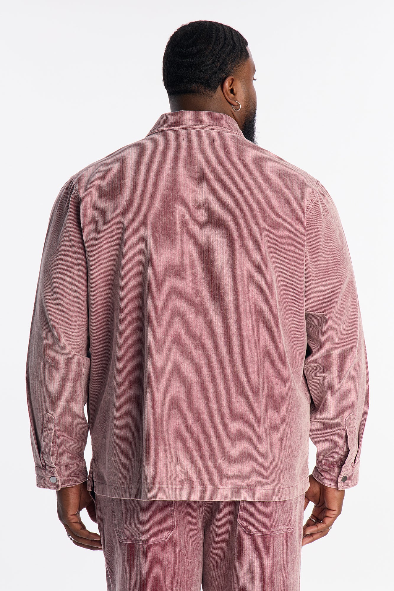 متوفر بألوان الأسود الحمضي، الأزرق الباهت والعنابي. أكمام طويلة، 100% قطن، إغلاق بأزرار، نسيج مخمل مضلع (كوردروي). نسقيه مع “بنطال شي تاون المضلع المستقيم”. مستورد.